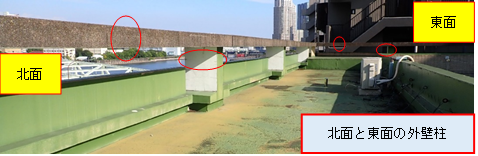 建物屋上には丸環がなく、ロープの支持物となる個所は、建物2面の外壁柱。ここにスリングを連結し、2本のロープを緊結します。~赤楕円形部~