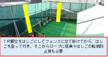 と定められていますが、作業者はライフラインに墜落阻止器具を連結し、メインロープに搭乗することを検討しなければなりません。したがって、右注記とおり、黄色表示のはしごをフェンスに立て掛けて登り、そこからロープへの搭乗となります。