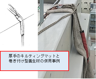 に定められているとおり、フェンス上部に走る水平支柱(上写真黄色〇枠部)及びフェンス下の建物パラペット角部には、ロープの切断防止策となる厚手の布製養生材や巻き付け型養生材の使用も必要不可欠となります。