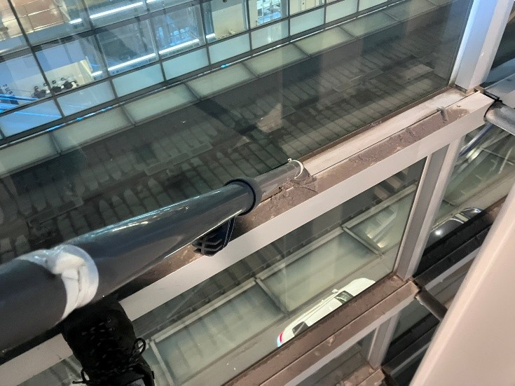 今回の駅では、以前は年2回ほど、長柄の先端にフラワークリーンを取り付け、見えるところを地上からバサバサ除塵をしていたようですが、コロナ禍でストップして数年ぶりの作業とのことで、埃の量が大変なことになっていて、フラワークリーンでは綺麗に除塵できそうにありません。また、舞った埃の回収に大変な時間と労力が必要となるので、時間制限のある駅の清掃には適しているとはいえません。そこで今回は、手の届くところまでロープでアクセスし、掃除機で吸引して、埃が舞わないように作業することにしました。
