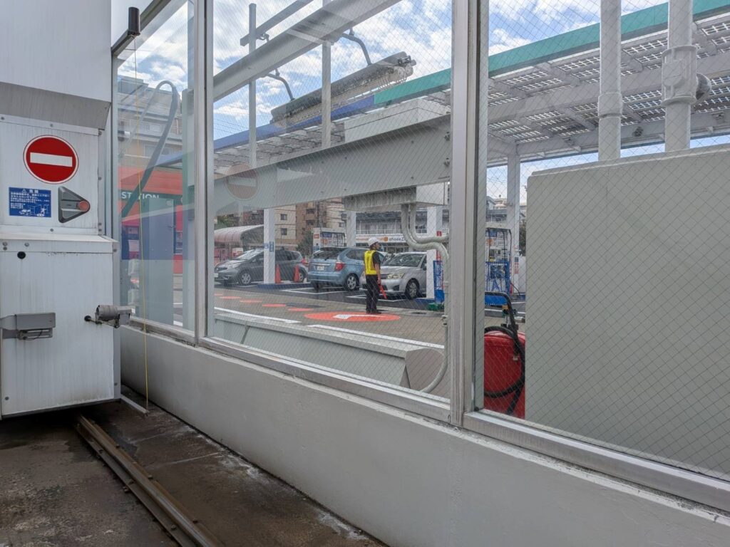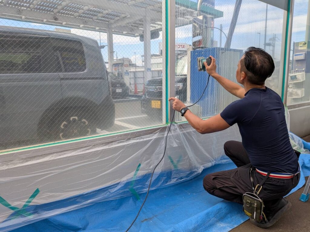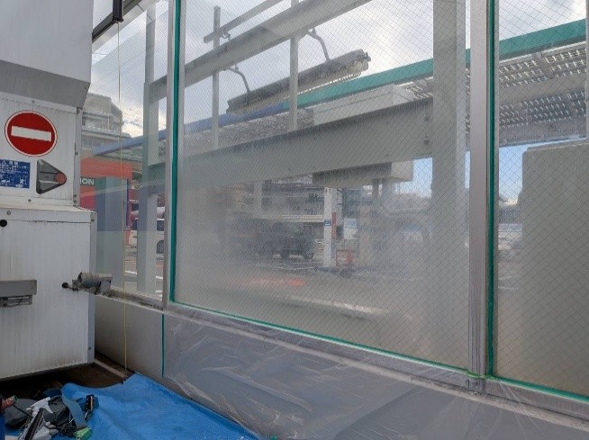 ガソリンスタンドの洗車場のガラスにウロコ現象が発生しているので除去して欲しいとの依頼をいただきました。