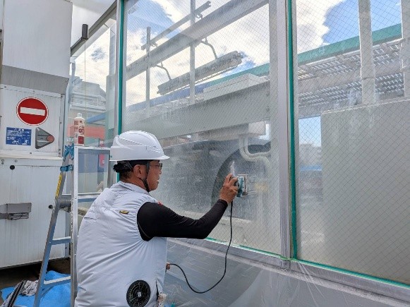 今回はダイヤ粒子配合の専用パットとダイヤ粒子配合の専用液剤を使用し、オービタルサンダーで研磨しました。時間のかかる作業(1日数㎡…)ですがガラスを傷つける心配がないので安心して作業が出来ます。